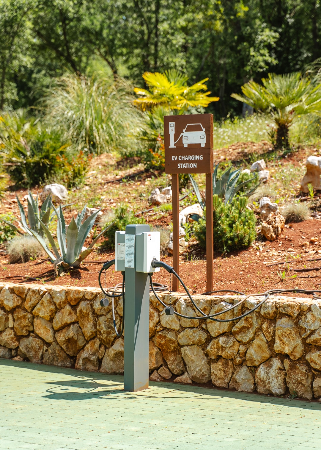 • Električna punionica za automobile: usluga dostupna svima, besplatna za goste kampa, informacije i pomoć dostupni na rampi